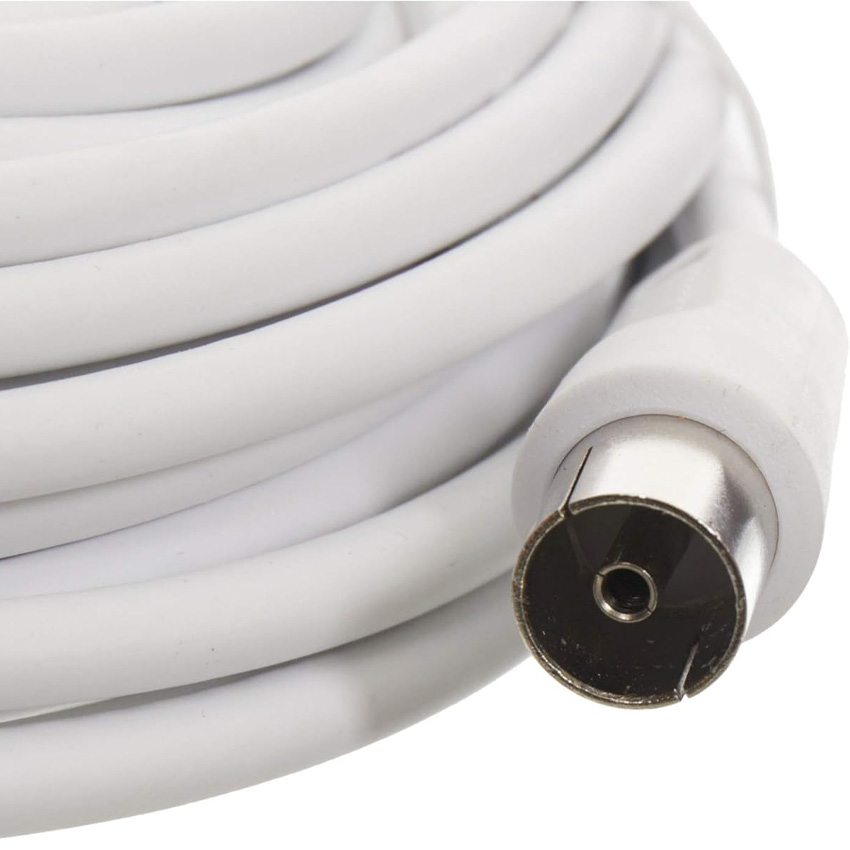 Cable de TV de 5 m, color blanco, para conexión de dispositivos de audio y video, compatible con TV y equipos multimedia.